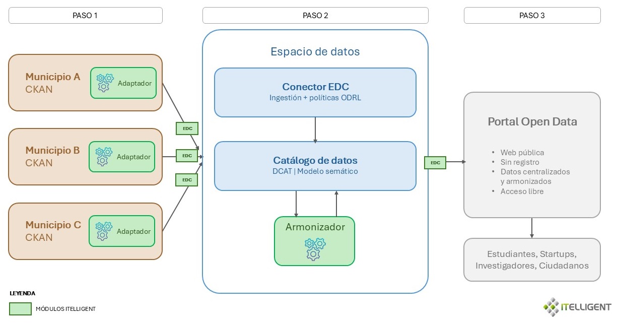 - Paso 3 — El Espacio de Datos expone un portal de open data de acceso libre. Una web pública, sin registro, donde cualquier persona —por ejemplo, un estudiante, un emprendedor, un investigador— puede acceder al catálogo centralizado y armonizado. Desde ITELLIGENT estamos trabajando en conectar este portal de open data mediante un conector EDC con el catálogo del Espacio de Datos, cerrando así el ciclo.
